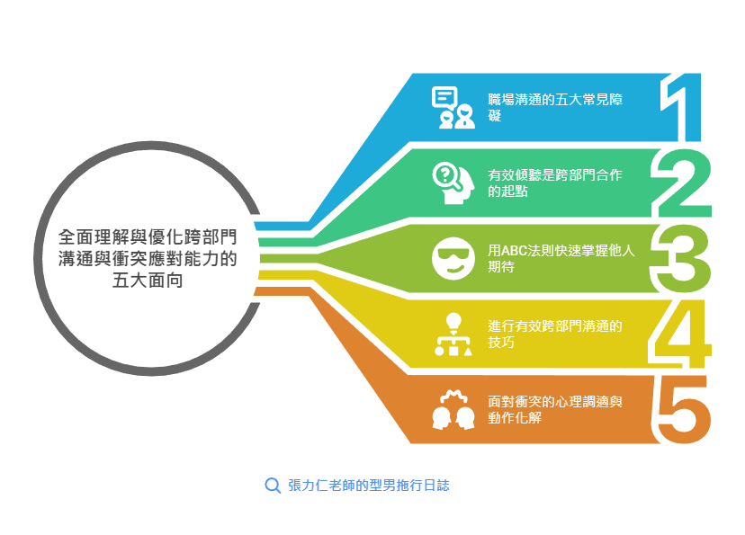 有效的跨部門溝通,不只是單純說清楚、講明白,更是一種綜合了傾聽、同理、策略與心理調適的專業技能。這篇文章將帶你從五個面向,全面理解與優化你的跨部門溝通與衝突應對能力。